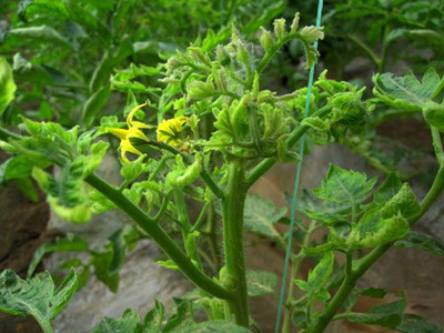【症状】染病番茄植株矮化,生长缓慢或停滞,顶部叶片常稍褪绿发黄、变小,叶片边缘上卷,叶片增厚,叶质变硬,叶背面叶脉常显紫色。生长发育早期染病植株严重矮缩,无法正常开花结果;生长发育后期染病植株仅上部叶和新芽表现症状,结果数减少,果实变小,成熟期果实着色不均匀(红不透),基本失去商品价值。